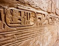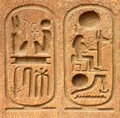 En la parte frontal cada cartucho está inscrito el nombre del faraón en escritura jeroglífica y en la parte trasera se haya la transcripción en nuestra lengua.